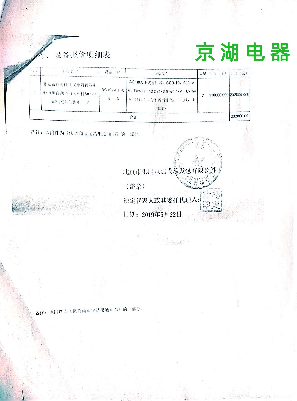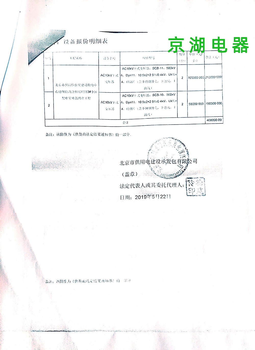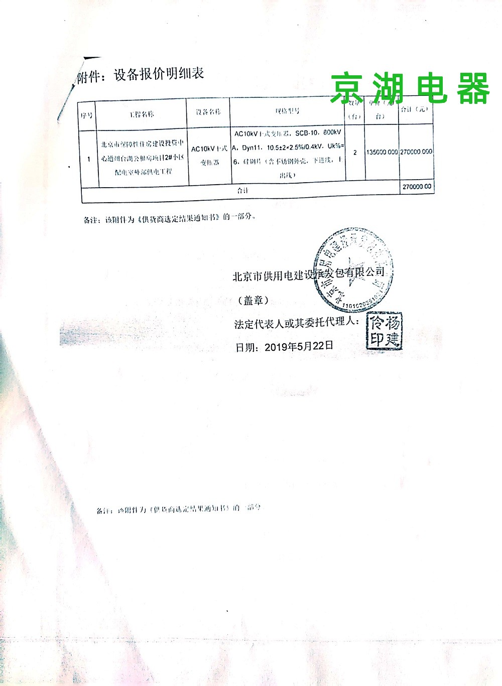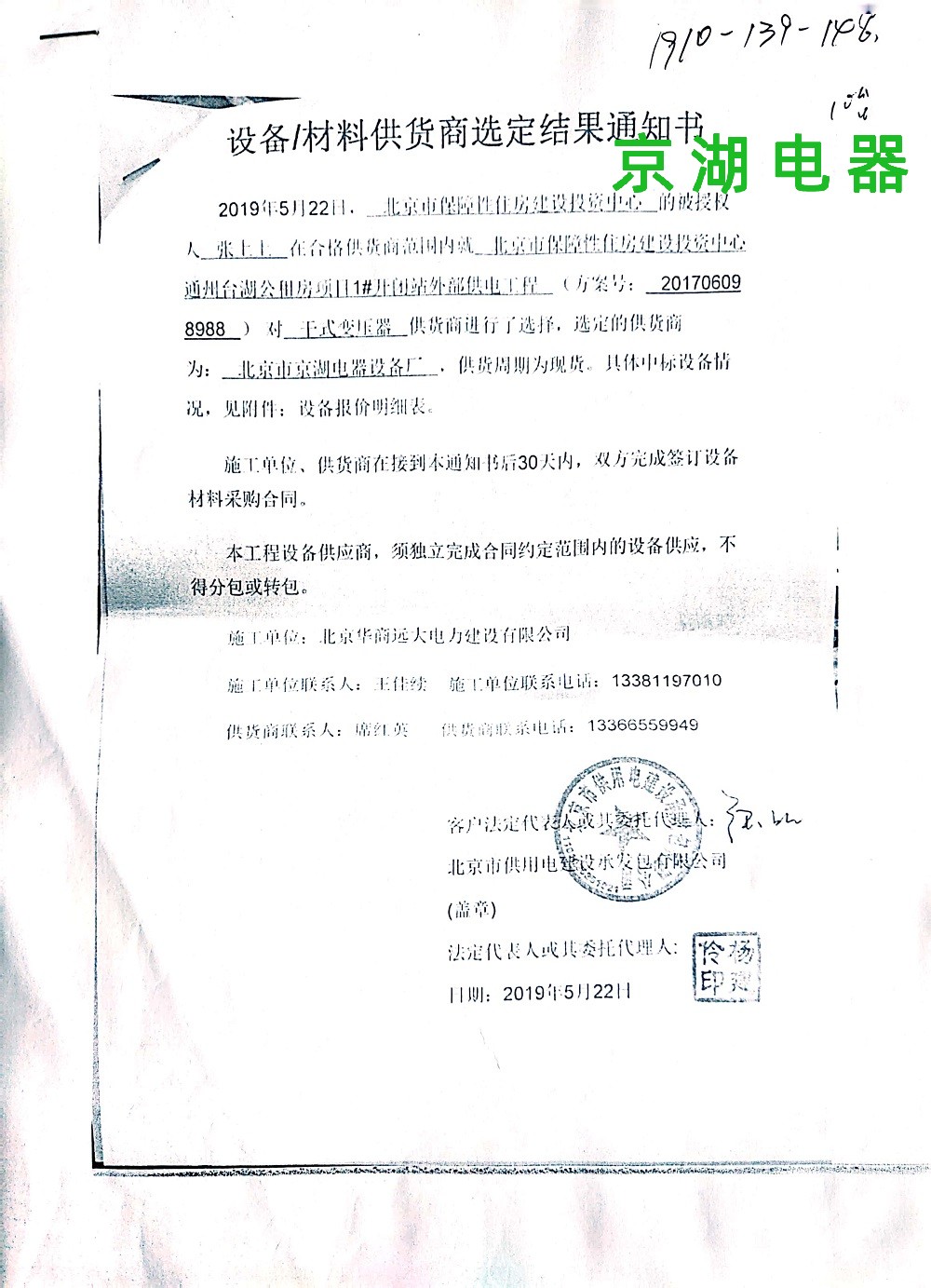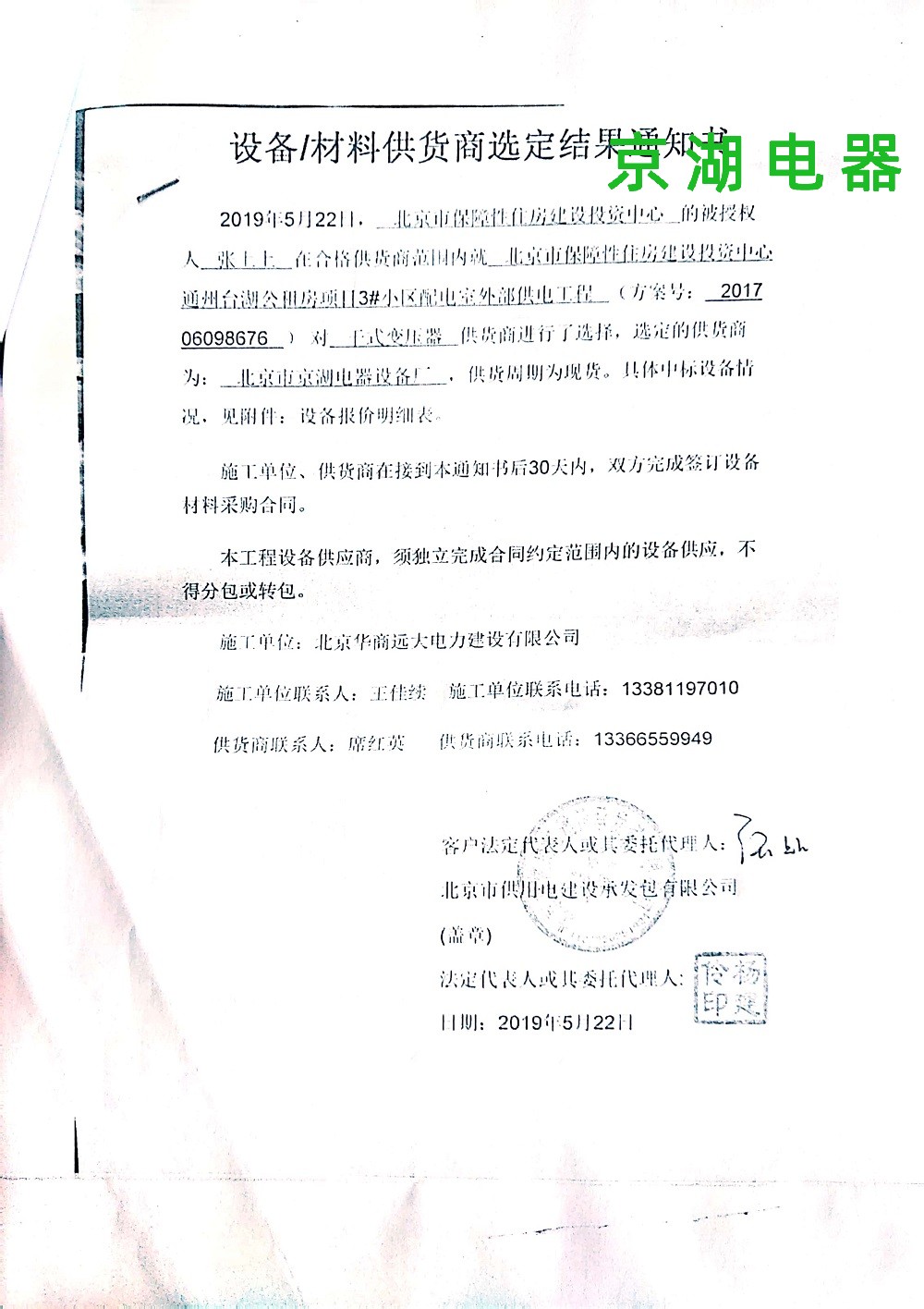 北京市保障性住房建設(shè)投資中心 供貨商選定結(jié)果通知書 2019年5月22日