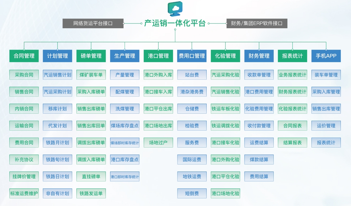 核心功能包括:合同管理模塊、計(jì)劃管理模塊、鐵路發(fā)運(yùn)模塊、港口管理模塊、運(yùn)單管理模塊、生產(chǎn)管理模塊、庫存管理模塊、費(fèi)用管理模塊、化驗(yàn)管理模塊、結(jié)算管理模塊、報(bào)表管理模塊、數(shù)據(jù)大屏模塊、客商平臺(tái)子系統(tǒng)、現(xiàn)場(chǎng)管理子系統(tǒng)(排隊(duì)叫號(hào)、門禁系統(tǒng)、無人值守稱重系統(tǒng)、裝車驗(yàn)收系統(tǒng))。