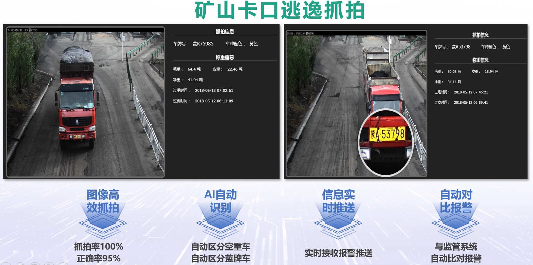 每個(gè)煤礦安裝專業(yè)卡口攝像機(jī),實(shí)時(shí)抓拍每個(gè)出礦車輛,并與銷售系統(tǒng)進(jìn)行數(shù)據(jù)對(duì)比分析及時(shí)發(fā)現(xiàn)未異常情況,實(shí)現(xiàn)現(xiàn)報(bào)警。